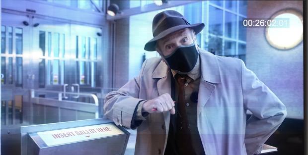 Surveillance footage of a drop box in Atlanta, used in the film 2000 Mules as evidence of a “mule” whom filmmaker Dinesh D’Souza claimed was paid to stuff this and 26 other ballot boxes. According to D’Souza, this was “the smoking gun! O.J. Simpson…leaving the scene of a crime!” But it doesn’t show anything more than a Black man voting.Follow me on this.